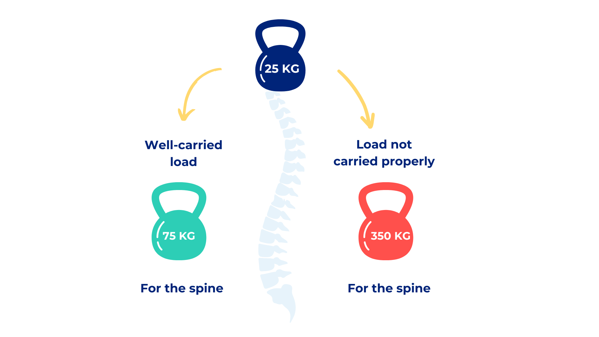 Indeed, a properly carried load of 25 kg will represent 75 kg for our spine. Whereas, if carried incorrectly, with rounded arms and back, the pressure of the same load will represent 350 kg on the companion’s spine.