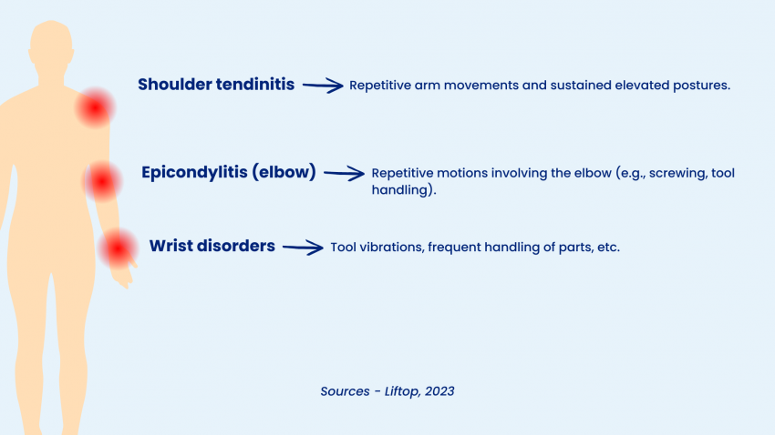 - First, the lack of muscular variation is a major issue: the same tendons, joints, and muscle groups are engaged continuously, without enough time to recover. Whether it’s tightening a component, positioning a windshield, or attaching a door, the identical repetition of movement creates mechanical stress always on the same area, sometimes hundreds of times a day.