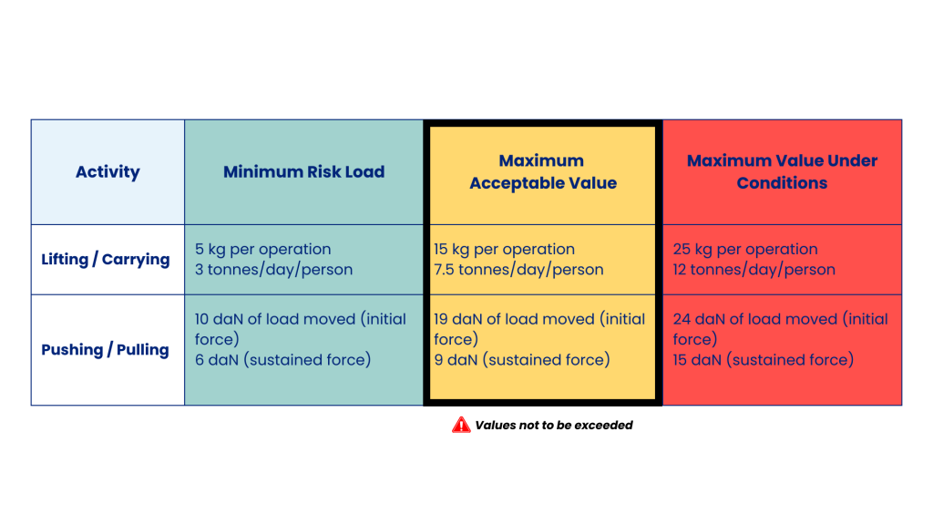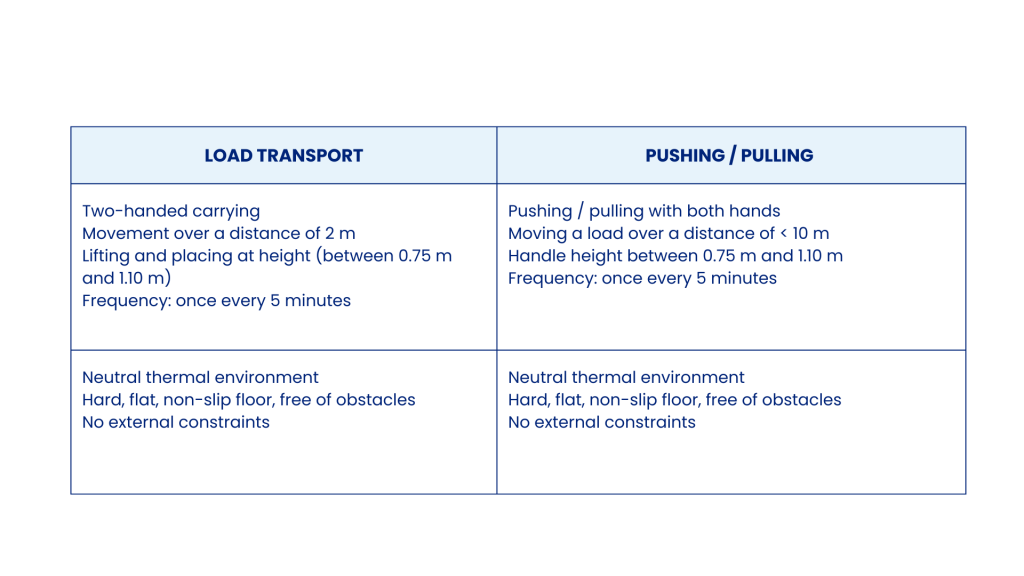 As mentioned previously, the NF X35-109 standard defines reference threshold values applicable to operations involving lifting, lowering, carrying, placing, pushing, or pulling a load.