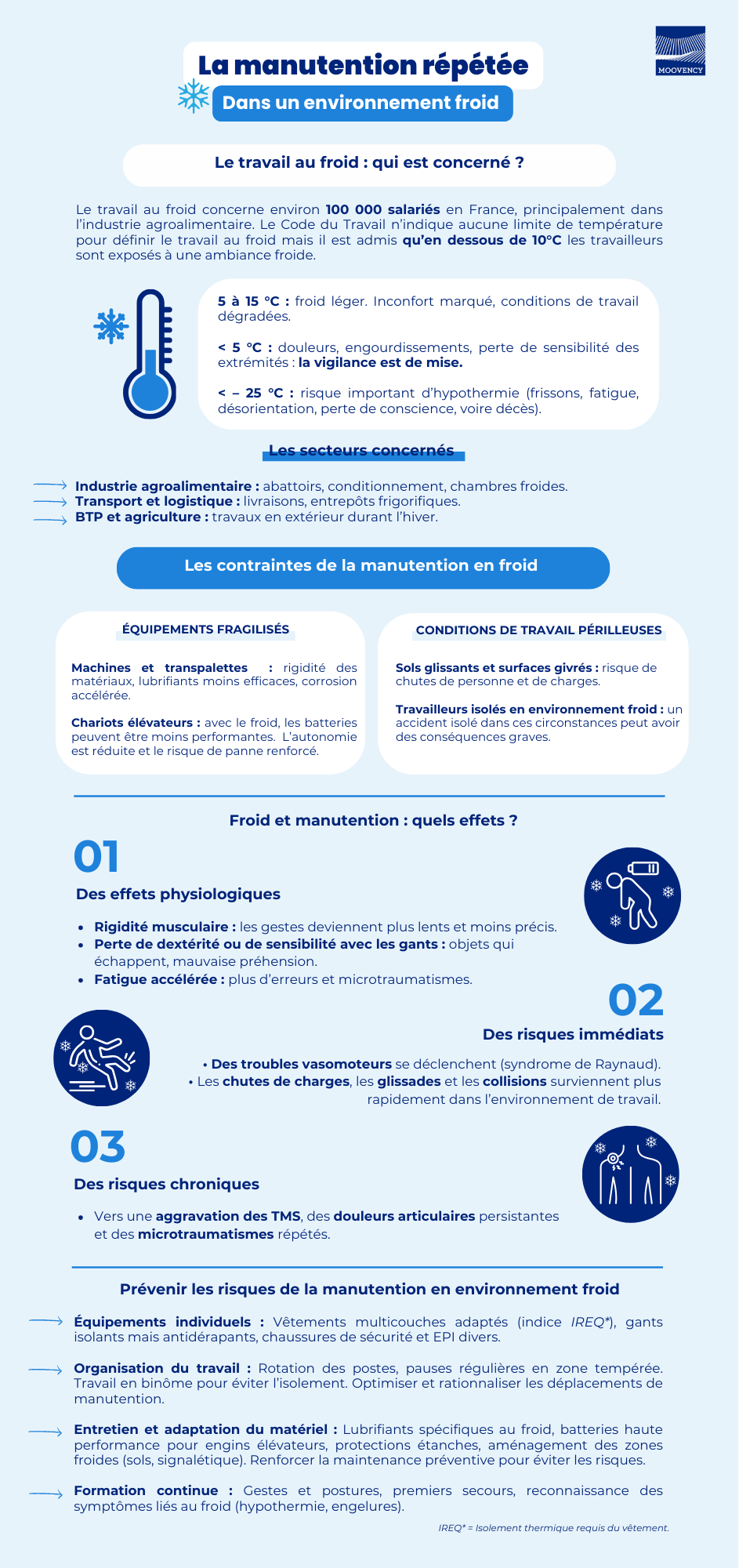 L’infographie met en évidence les effets du froid sur la manutention et les risques auxquels sont exposés de nombreux salariés. Ces constats rappellent l’importance de passer d’une logique de réaction à une logique de prévention active.